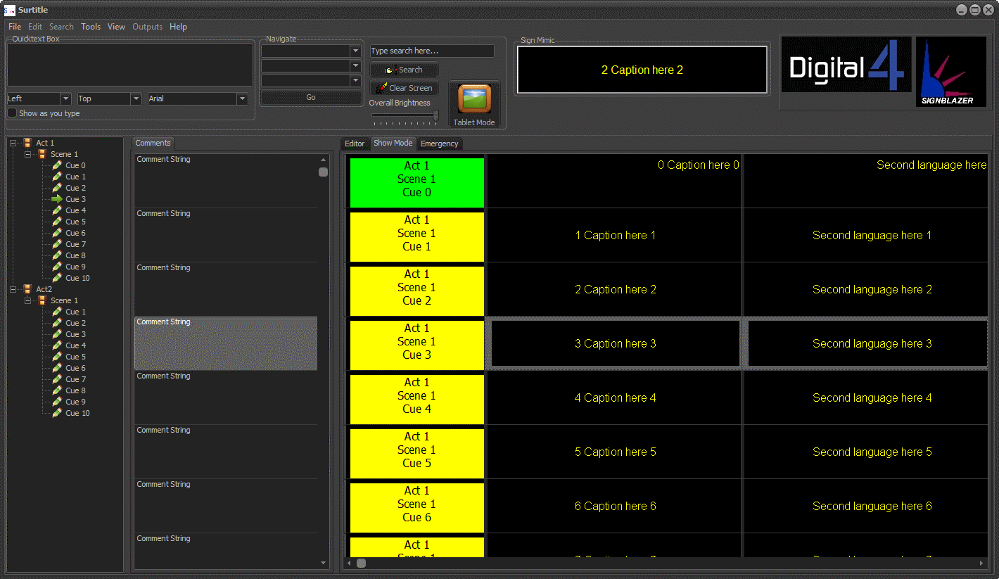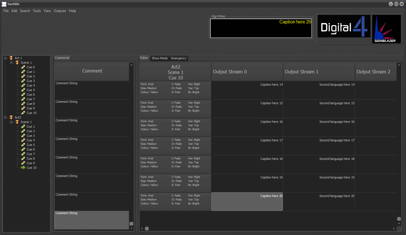 Once the surtitles/captions/subtitles have been edited and the outputs configured the same software application is used for output to the displays. There is clear user feedback whilst operating so that the operator knows whereabouts in the script they are. There is a visual representation of the display on the main screen, there is also a communications monitor that will alert in the case of lost communication with an output